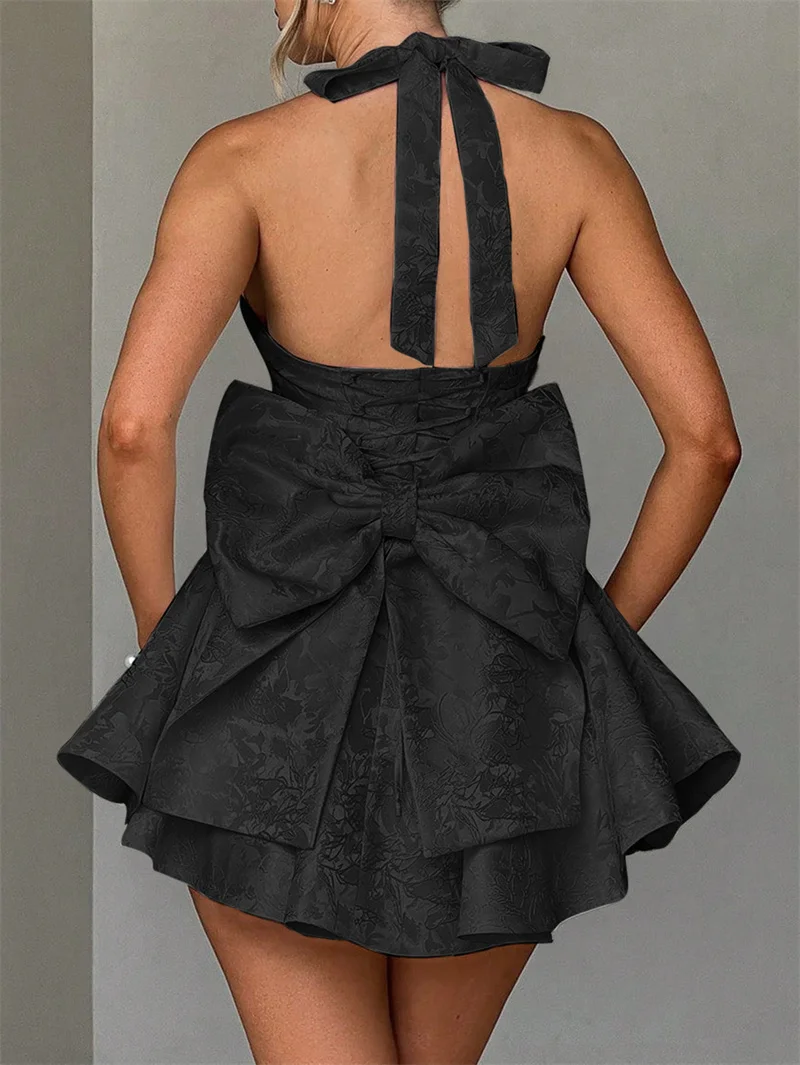 Featuring a sleeveless halter neckline, sultry lace-up back, and a dramatic oversized bow for added charm. Made from high-quality polyester, its body-hugging silhouette enhances your curves while the backless design adds a bold, seductive touch.