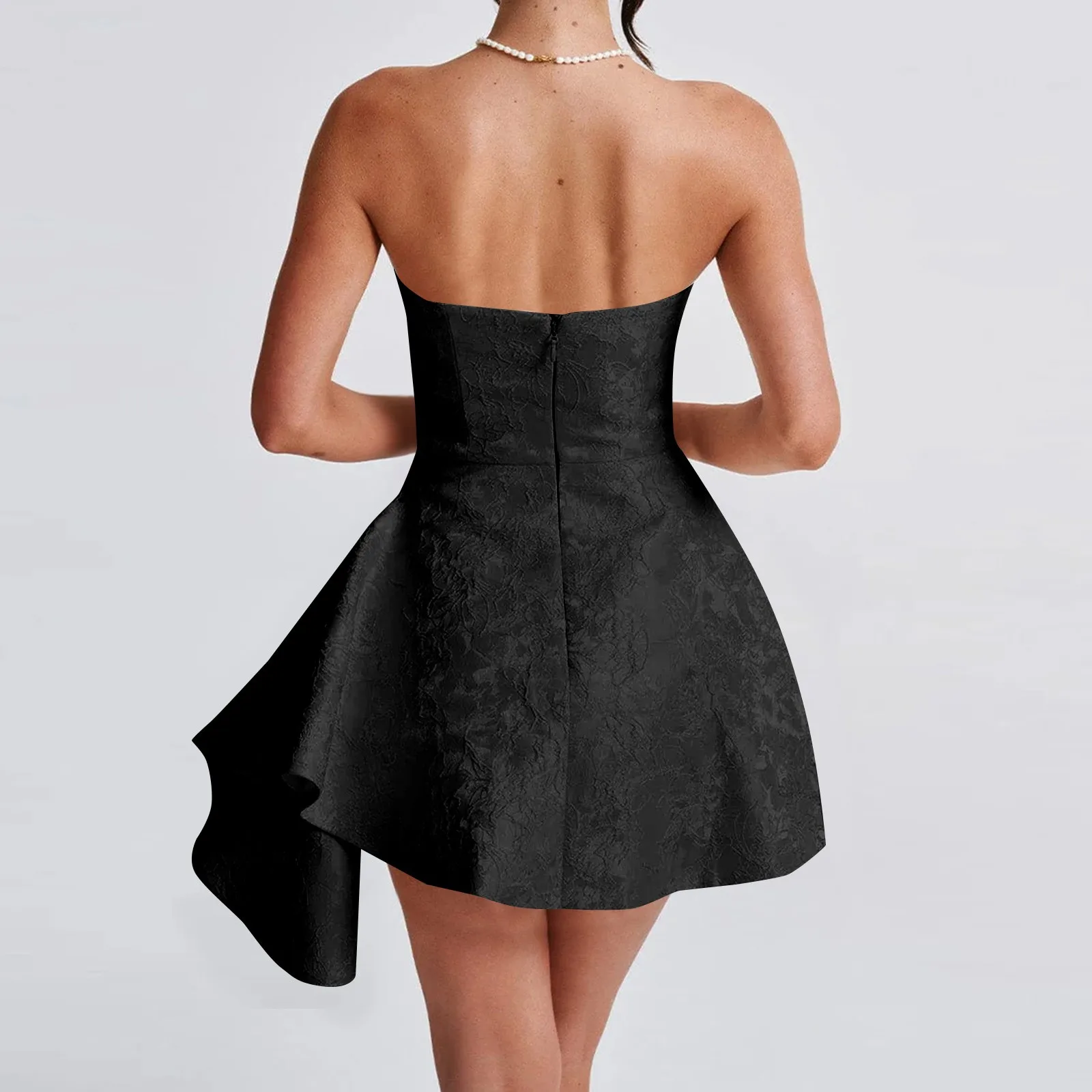 Designed to captivate with its luxurious jacquard pattern, strapless silhouette, and bold backless design. Crafted from smooth, high-shine satin fabric, this dress brings elegant looks to life while adding a hint of sensuality.