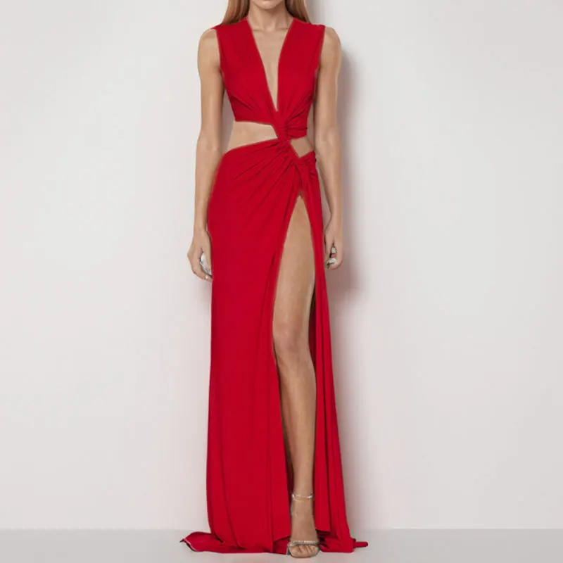 Dotée d'un décolleté en V profond et audacieux, de détails ajourés complexes et d'une silhouette élégante sans manches alliant élégance et sensualité. Conçue pour les femmes qui aiment briller, cette robe présente une coupe ajustée flatteuse, une fente séduisante jusqu'aux cuisses et des détails luxueux qui attirent le regard sous tous les angles.
