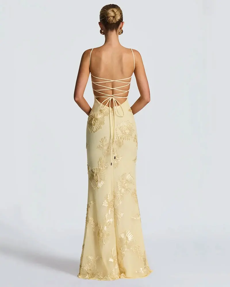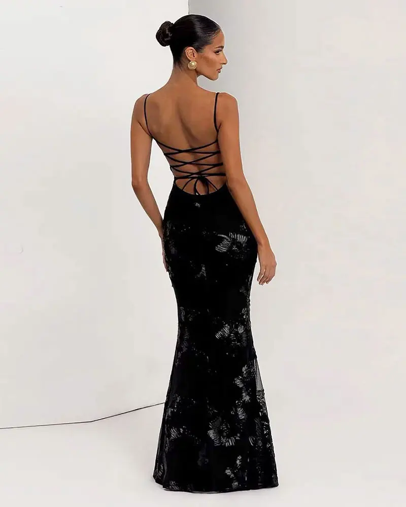 Une fusion saisissante d'élégance et de séduction. Confectionnée en soie luxueuse et dentelle délicate, cette robe longue arbore une silhouette sirène gracieuse qui sublime chaque courbe. Son dos nu et ses bretelles corset réglables lui confèrent une touche à la fois sensuelle et raffinée, tandis que son soutien-gorge intégré offre un maintien optimal.