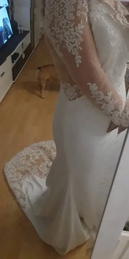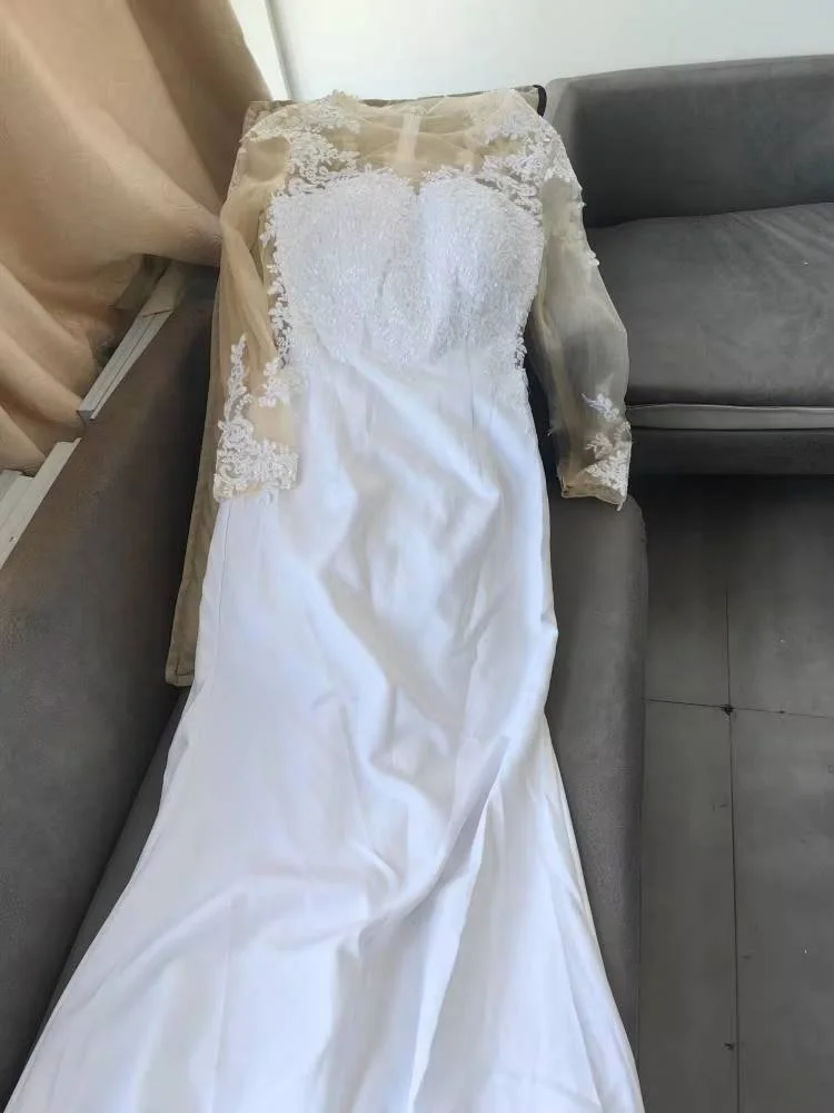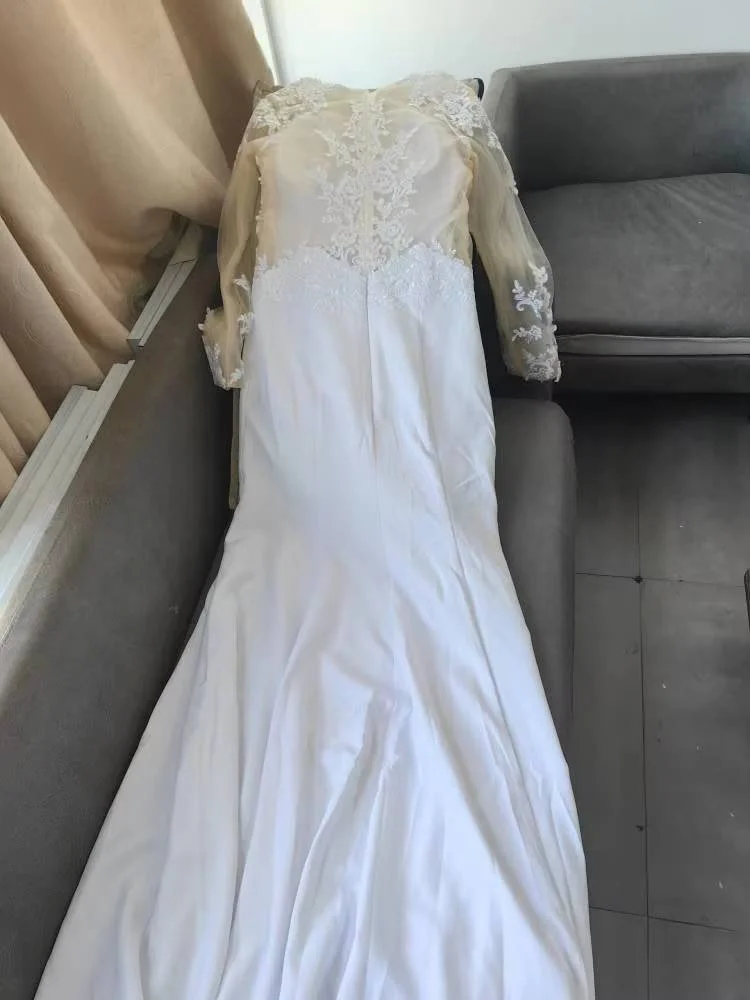 The scoop neckline brings a classic, modest touch, while the full lace sleeves add refinement and subtle coverage, perfect for brides seeking elegance without sacrificing femininity. The intricate lace detailing elevates the satin base, giving the dress a noble and dignified finish suitable for church weddings, romantic ceremonies, or elegant receptions. Every stitch is thoughtfully designed to enhance comfort and beauty, ensuring you feel as incredible as you look.